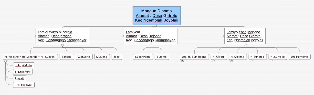 Kyai Abdul Jalal I (Pendiri Perdikan Kalioso) bin Kyai Niti Manggolo (Kyai Kerti Manggolo I) bin Kyai Honggowongso bin Kyai Gulu bin RM Tmg Karto Nagoro bin Pangeran Adipati Manduraredjo (Ki Djuru Wiroprobo I) bin Pangeran Mandura bin Ki Juru Martani (Maha Patih Mataram Kotagedhe) bin Ki Ageng Saba bin Pangeran Made Pandan bin Ki Wonosobo bin Ki Bondan Kejawan