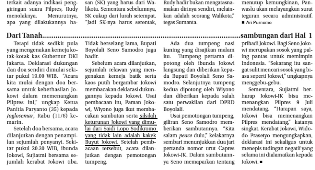 Nama Saidi Lopo Sodikromo muncul ketika acara Deklarasi Dukungan Calon Presiden di Desa Gumuk Rejo yang merupakan tempat kelahiran ibu Jokowi, Sujiatmi.