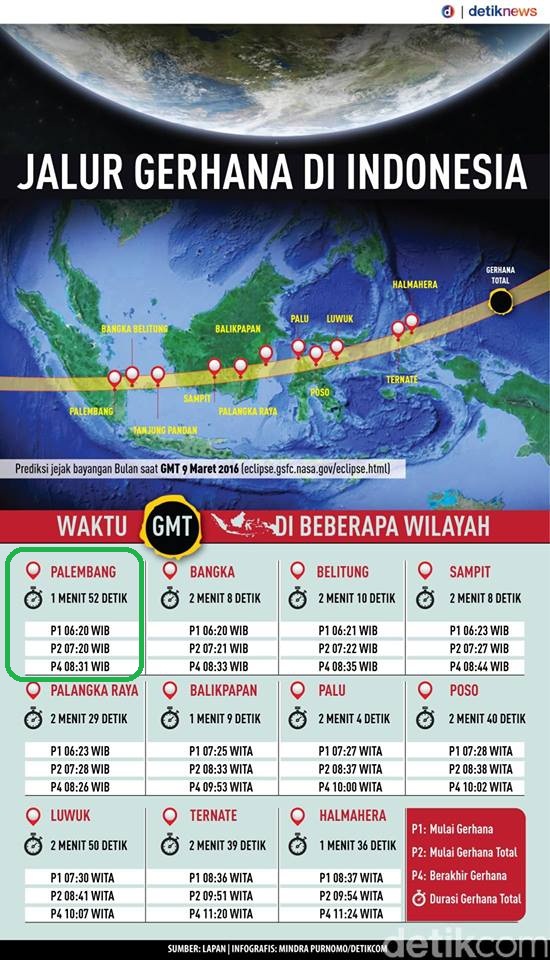 Diperkirakan Gerhana Matahari akan melintasi Palembang, Belitung, Bangka, Balikpapan, Luwuk, Sampit, Palu, Ternate, Palangkaraya, Poso serta Halmahera (sumber : antaranews.com).