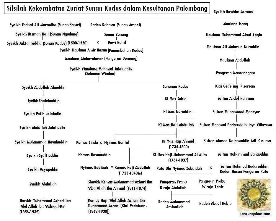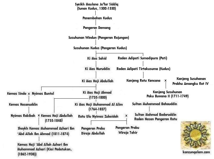 Nasab selengkapnya : Kemas Haji Muhammad Azhari ibn Kemas Haji Abdullah ibn Kemas Haji Asyiquddin bin Kemas Haji Syaffiuddin bin Kemas Muhammad Hayahuddin bin Kemas Abdullah Jalalludin bin Kemas Fatih Jalaludin bin Kemas Sholehuddin bin Kemas Abdullah Alauddin bin Kemas Wandung Mahmud Jalaluddin (Suhunan Windun Aljawi) (sumber : Kemas Haji Muhammad Azhari)