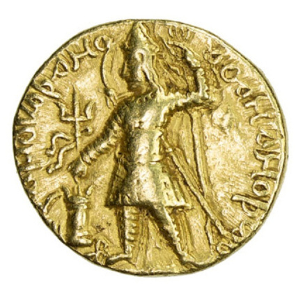 Perhatikan lambang trisula dalam uang logam kerajaan Kushan, di masa Vasu Deva I (191-230 M)