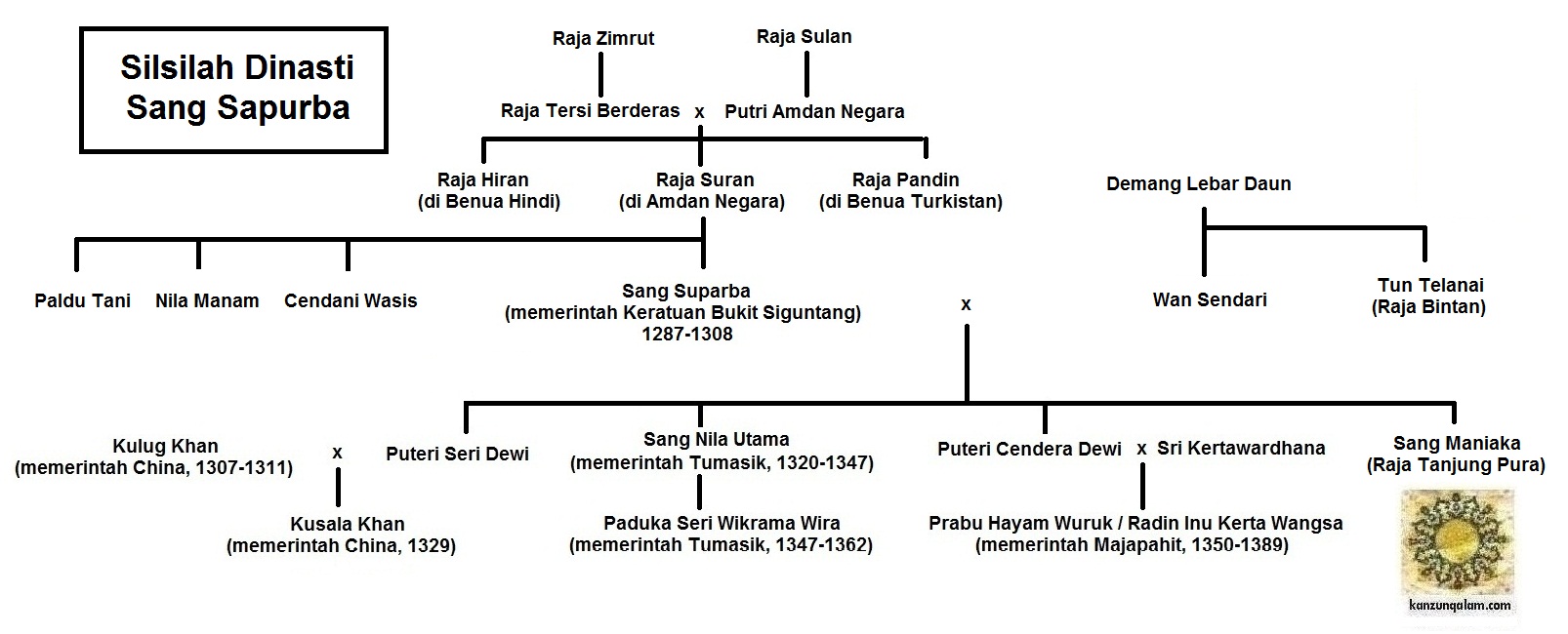 Dalam Sejarah Melayu diceritakan, salah seorang putri Sang Suparba bernama Puteri Seri Dewi menikah dengan Raja China dari Dinasti Yuan (Mongolia), diperkirakan Raja Cina itu adalah Kaisar Kulug Khan. Dari pernikahan ini lahir Kusala Khan, yang menjadi Kaisar Cina pada tahun 1329 M (sumber : [Misteri] Puteri Melayu, ibunda Kusala Khan (Kaisar Dinasti Yuan, memerintah tahun 1329) ?).