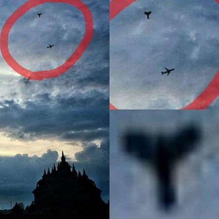Foto tersebut tanpa sengaja menampilkan 2 objek di udara, yaitu 1 pesawat komersial dan 1 objek tidak dikenal dalam bentuk siluet yang cukup jelas.