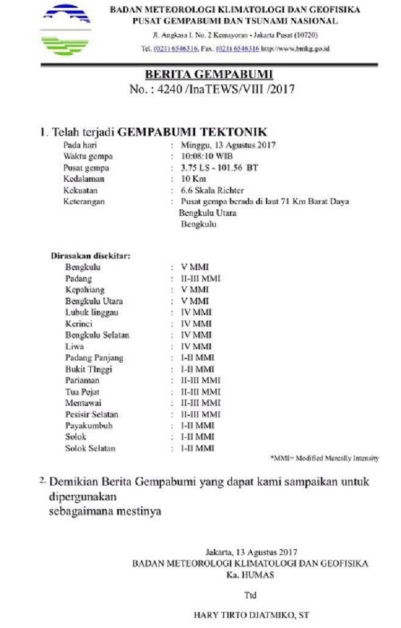 Sekilas Info : Gempa 6,6 SR di Bengkulu Utara, 13 Agustus 2017