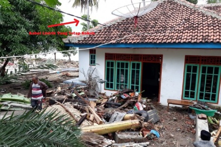 Rumah berwarna dinding putih serta kusen jendela hijau tersebut, tetap berdiri kokoh bahkan tiang listrik ke rumahnya tetap bertahan, sementara rumah tetangga di kiri dan kanan sudah tidak berbentuk lagi.