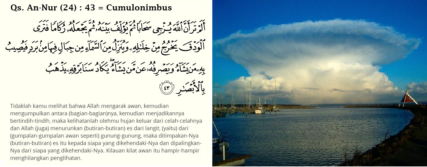 Karakteristik dari Cumulonimbus, sangat mirip dengan gambaran awan, yang terdapat di dalam Al Qur’an, yakni QS. An-Nur (24) ayat 43 (Sumber : books.google.co.id)…