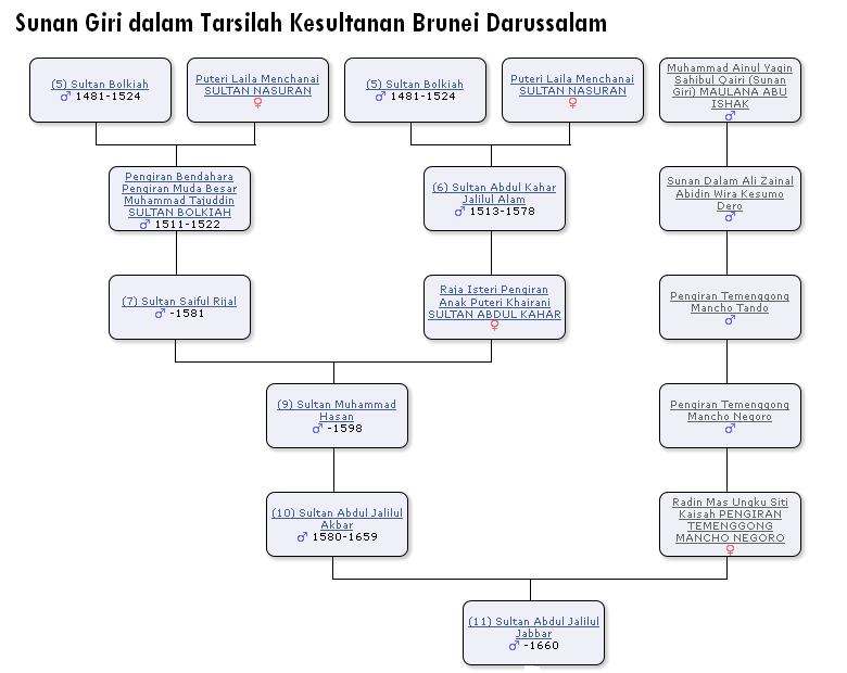 Hubungan kekerabatan Kesultanan Brunei dengan Dinasti Giri Kedaton (Sunan Giri), berdasarkan kepada penelitian ahli sejarah Brunei, Prof. Dr. Haji Awang bin Mohammad Jamil Al-Sufri, yang pernah disampaikan pada simposium sejarah di Kampus UGM Yogyakarta tahun 2009 (Sumber : Kajian Sejarah Kerajaan Brunei).