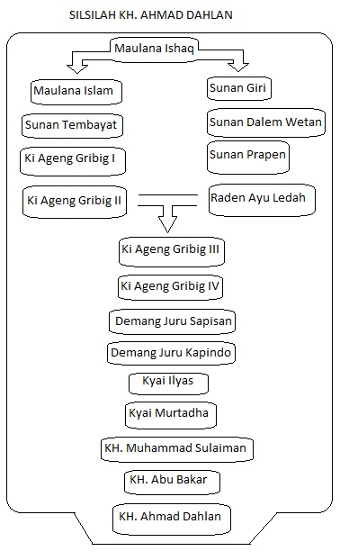 Kyai Ahmad Dahlan bin Kyai Abu Bakar bin Kyai Muhammad Sulaiman bin Kyai Murtadha bin Kyai Ilyas bin Demang Jurang Juru Kapindo bin Demang Jurang Juru Sapisan bin Ki Ageng Gribig Jatinom (Maulana Sulaiman) bin Sunan Prapen (Sunan Giri IV).