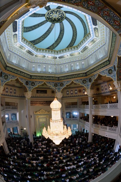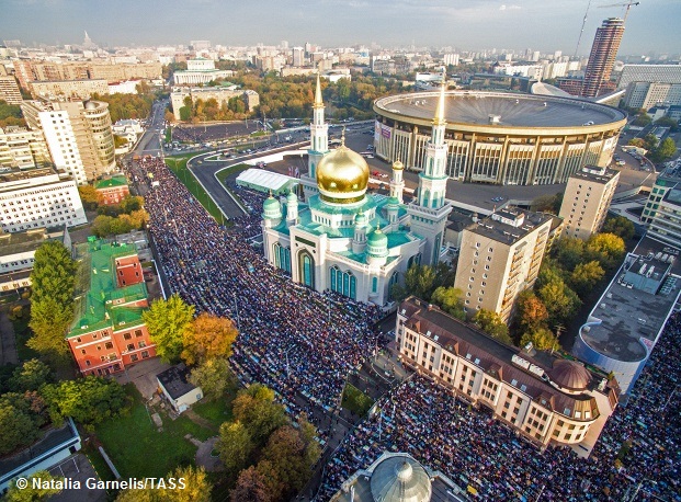 Diperkirakan sekitar 140.000 jamaah shalat Id, membanjiri jalan-jalan disekitar masjid yang baru diresmikan Presiden Rusia.