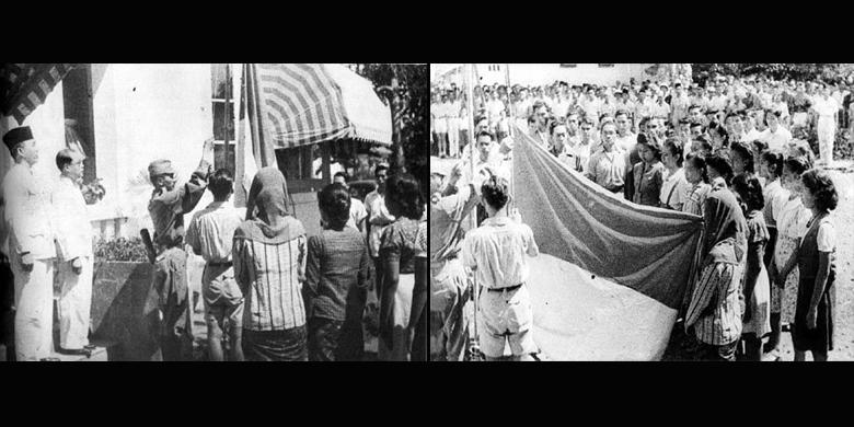 Foto pertama, ketika Soekarno membaca teks proklamasi. Foto kedua, pengibaran bendera Merah Putih oleh Latief Hendraningrat, anggota PETA. Foto ketiga, suasana upacara dan para pemuda yang menyaksikan pengibaran bendera.