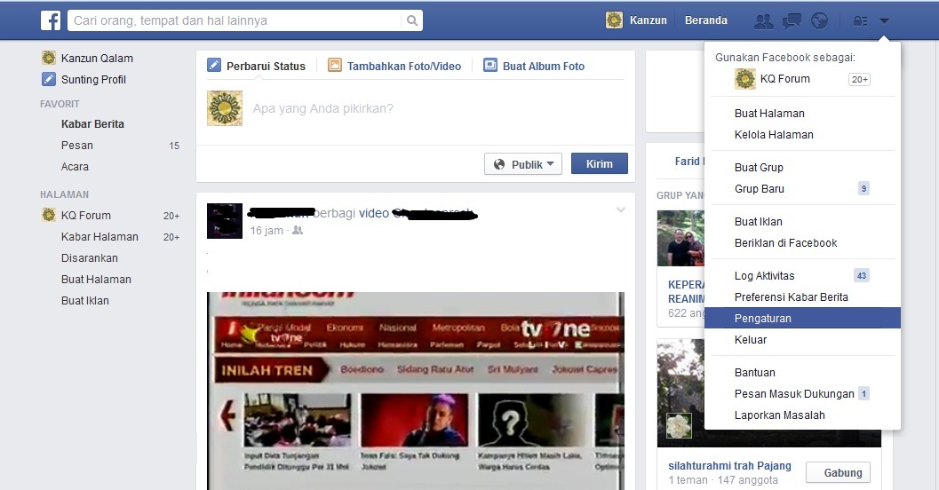 1. Klik pada sisi kanan atas Facebook anda, dan pilih Pengaturan