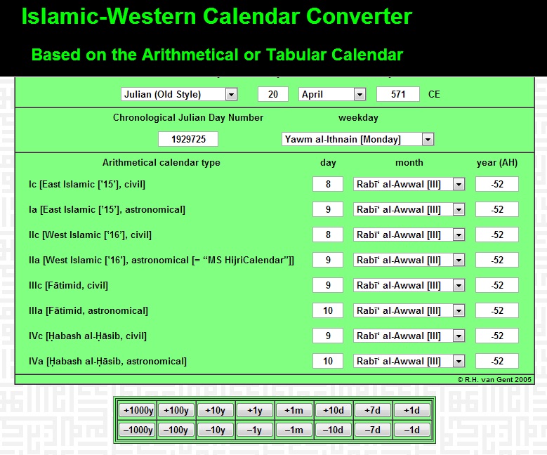 Berdasarkan tulisan sebelumnya, Menghitung saat Kelahiran Nabi Muhammad, melalui hari wafatnya ?, kita memperoleh informasi Kelahiran Nabi Muhammad adalah pada tanggal 9 Rabi’ul Awal 52 SH (malam hari), yang bertepatan dengan 20 April 571 M.
